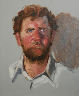 This is my second week painting Tom and as I wasn't able to choose a position whereby I could do a profile or three-quarters view, I decided to change medium, so this is my pastel version. The one thing Tom does move is his eyes, so to help ring the changes from the last sitting, I tried to catch him looking to the side. Tom does have a very florid complexion so it is always a challenge to keep the effect of the light working within the correct values whilst still showing his high colour.